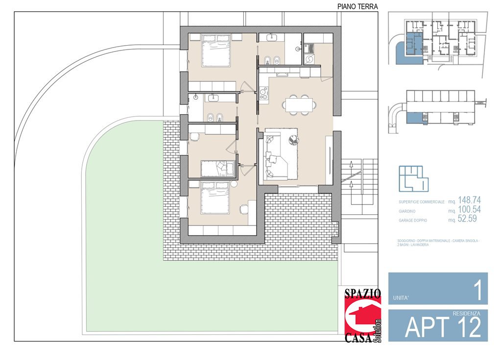 Spazioso quadrilocale con ampio giardino ad angolo, inserito in una moderna palazzina in fase di realizzazione. L'appartamento presenta una zona giorno di generose dimensioni, con affaccio sul portico vivibile, zona cottura/pranzo servite da dispensa/lavanderia; corridoio in zona notte, tre camere da letto, delle quali due matrimoniali (una con bagno padronale) e secondo bagno. Al primo interrato autorimessa doppia, d'oltre 50 metri quadri. Possibilitą di progettazione degli interni seguita da un'arredatrice. Previste finiture di alta qualitą, con riscaldamento e raffrescamento a pavimento, VMC, serramenti con tripli vetri, scelte ampissime tra vari gres o parquet, videocitofono, fotovoltaico, ecc.